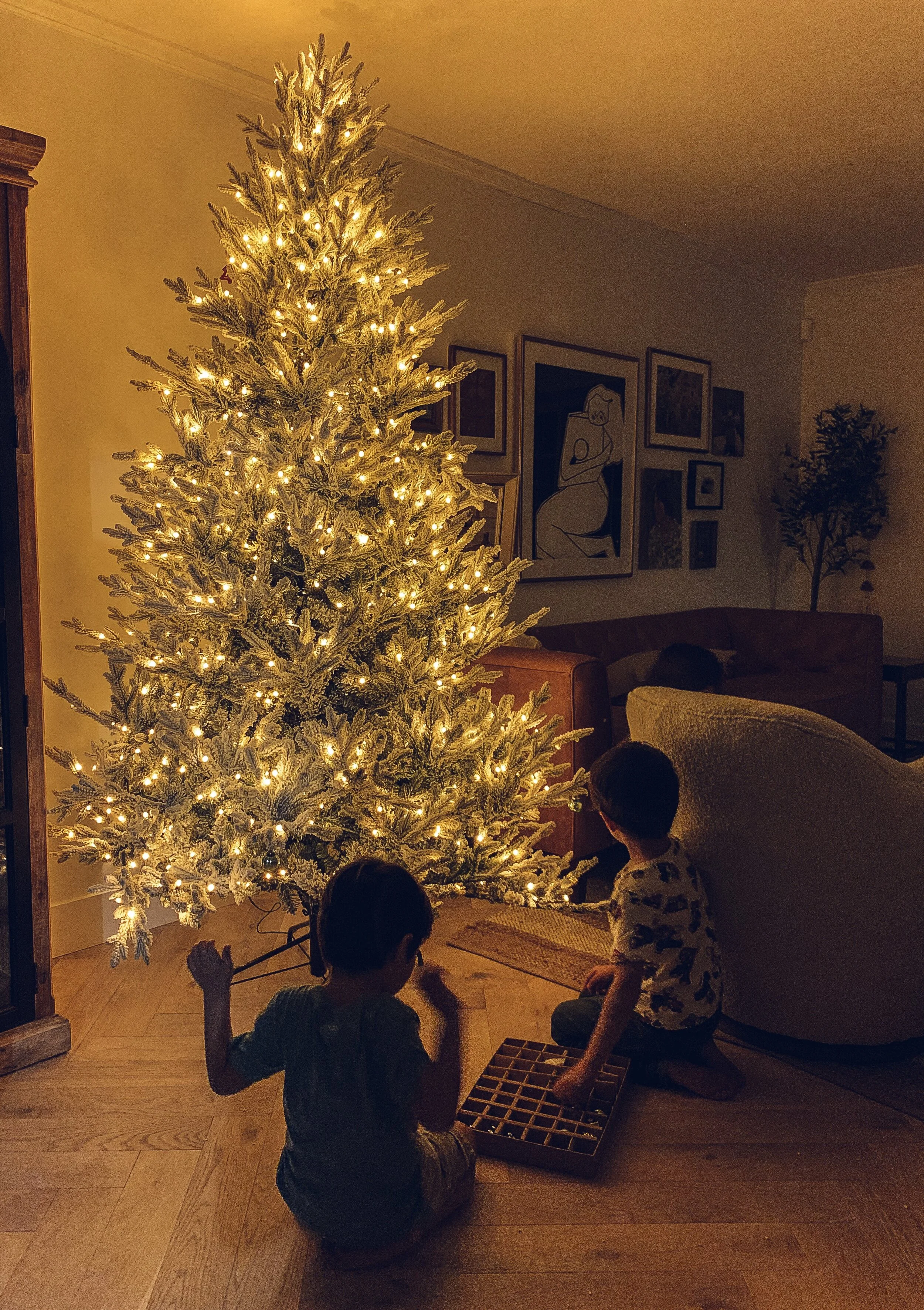 We just purchased this Christmas tree from Home Depot (UPDATE: This tree is out of stock, but here’s a similar option) and I am in love. I saw it a few weeks ago when going to purchase some materials for the kids bathroom and after some research trying to find something similar for a better deal, this is the best I could find in this style for this price. So I am sharing it with you because it is very pretty and realistic looking. A flocked tree in California is not very “realistic” but I don’t mind the extra magic of some fake snow in our living room. It gives that extra “winter wonderland” vibe and we love it so much. My favorite part about the tree besides the pretty realistic branches are the light settings, the lights blink little tiny glowing candles, it is so soothing to watch.