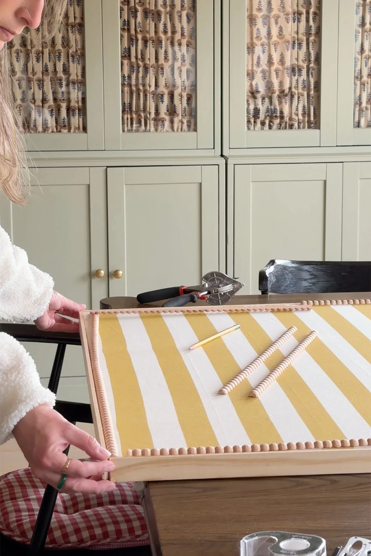 Then use hot glue to attach the trim around the edges of the board, creating a simple frame.