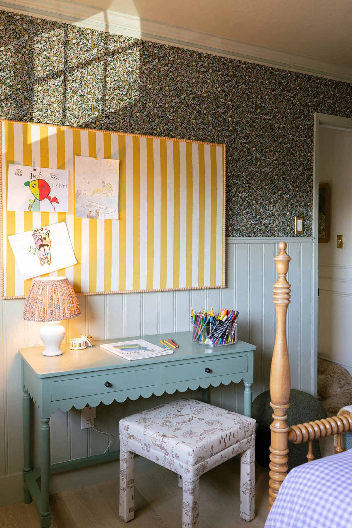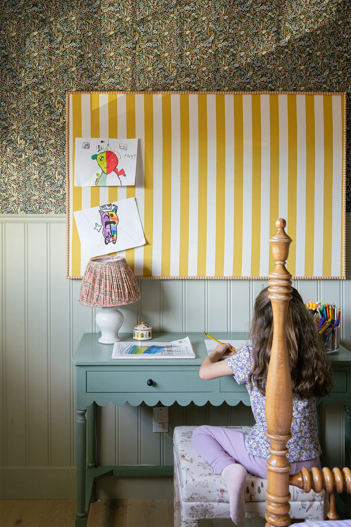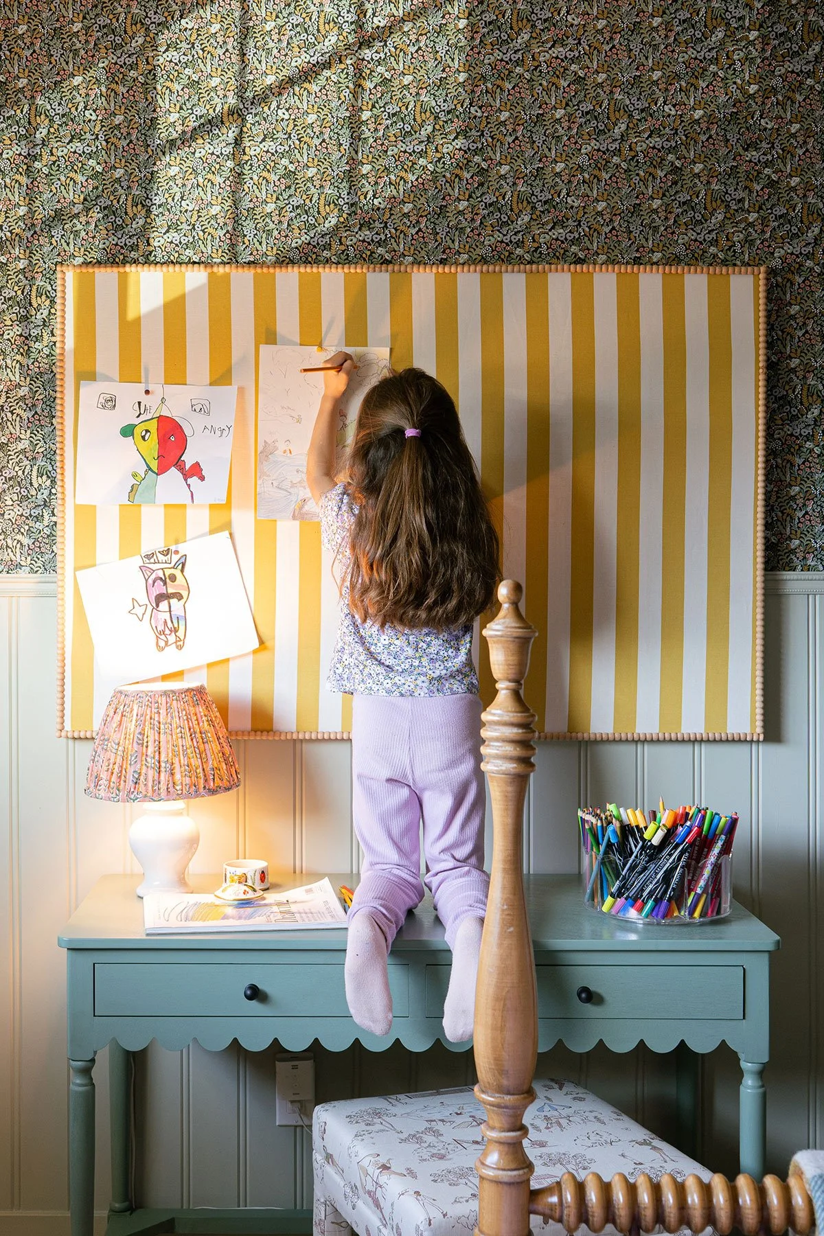 I moved furniture around in Ella’s room to create a little desk area. A spot where she could keep her supplies, papers, colors, and markers organized. A place that feels completely hers. And then the idea sparked: How are we going to display her art?